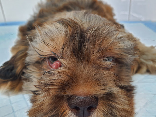 Вскоре после оперативного лечения левостороннего фолликулярного конъюнктивита аналогичная патология проявилась и на правом глазе. Размер и плотность образования значительно больше чем на левом. На фотографиях 1,2,3 отражено состояние правого глаза перед операцией. Фото 1. Фото 2. Фото 3. Состояние левого глаза за 14 дней до повторной операции - фото 4,5. Фото 6. Фото 7. Удаленное образование с указанием размеров поместили на фото 8. Фото 8. Таким образом, за 14 дней животному выполнили две операции (и на левом и на правом глазе). Прогноз благоприятный. Здоровья и успехов всем!