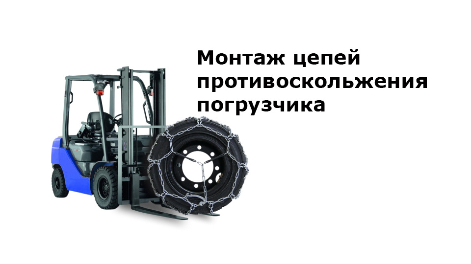 При движении погрузчика на заболоченных, заснеженных участках, скользких и обледенелых поверхностях контакт колес с покрытием ухудшается. В результате снижается устойчивость и проходимость техники, возрастает риск опрокидывания и аварий. Для безопасной работы в таких условиях рекомендуется использовать цепи противоскольжения. Приспособление, выполненное в виде колец с грунтозацепами, монтируется на передние колеса погрузчика и выполняет функцию протектора, улучшая сцепление колес с поверхностью. Важно понимать, что колеса разных производителей могут иметь разные фактические размеры при одинаковой маркировке. Поэтому в цепях противоскольжения есть дополнительная перемычка, что фиксируется к концевым звеньям хвостовой цепи. Если при первом натяжении на колесо цепь перекосилась, провисает и не прилегает плотно к покрышке, то дополнительная перемычка не нужна. Устанавливать цепи рекомендовано непосредственно перед выездом на скользкие поверхности. Монтаж цепей противоскольжения на колеса а