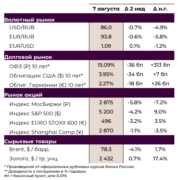 Финансовые активы: ключевые события, тенденции и прогнозы. Рисковые активы во главе с американским рынком акций (-4.2% с 24 июля) в начале августа захлестнула волна паники. Формальным триггером стали опасения скорого начала рецессии в США после публикации неубедительных данных по рынку труда (безработица выросла до 4.3%), однако неформальных поводов оказалось чуть больше. Во-первых, неожиданное повышение ставки в Японии и разворот иены против доллара привели к стихийному сокращению спекулятивных позиций в долларовых активах. Во-вторых, обострение обстановки на Ближнем Востоке повысило риски прямого вовлечения США в конфликт между Израилем и Ираном. В-третьих, новые меры по стимулированию потребления в Китае повысили страхи скорого замедления экономики Поднебесной. Коррекция российских акций также ускорилась (-5.8%), однако тут верх взяли внутренние факторы – рост ключевой ставки был усилен обстановкой на границе с Украиной. Товарные рынки ощутили на себе волнение мировых рынков: Bre