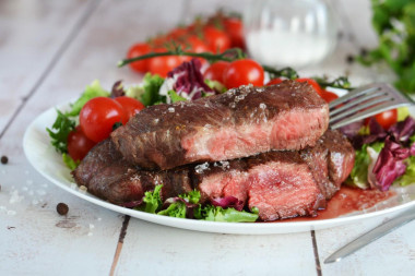 - Готовые стейки нужной степени прожарки выложите на тарелку, сервированную свежим салатом и овощами и подайте к столу.
