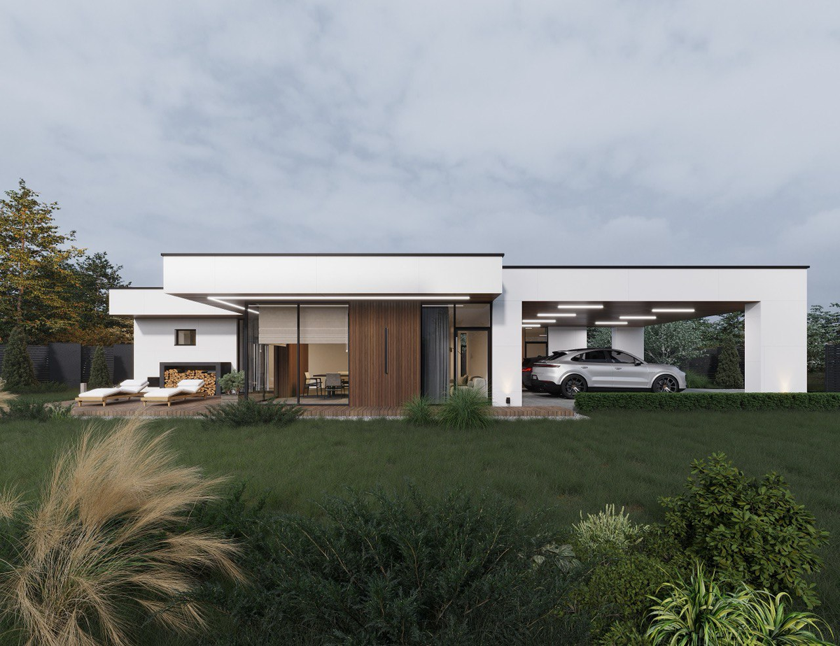 Небольшая уютная баня в современном стиле с террасой, где можно отдохнуть после разгоряченной парной. Большие витражные окна визуально увеличивают пространство, а помещение наполняется приятным естественным светом. Панорамный вид дополняет расслабляющий процесс парения чувством гармонии с окружающей природой. Баня совмещена с навесом для автомобиля и хозблоком, куда в непогоду или на зиму можно убрать уличную мебель и садовый инвентарь. Это здание — первая очередь строительства, вторым этапом будет построен дом по нашему проекту в том же стиле. __