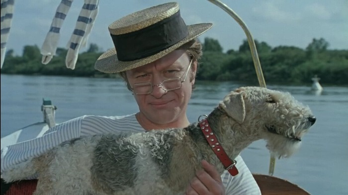 В 1979 году режиссёр Наум Бирман снимал фильм "Трое в лодке, не считая собаки". Андрей Миронов сыграл там шесть ролей, а он с детства боялся собак. Александру Ширвиндту трюковый пёс — злобный фокстерьер Герцог — в первый же съёмочный день прокусил руку так, что пришлось накладывать швы. Поэтому в эпизодах с ласками и объятиями свирепую собаку стали подменять дублёром. Им стал родственник Герцога — ласковый дурак фокстерьер Грех, который принадлежал моей будущей бывшей первой жене. С нею тогда у нас бурно развивались отношения, а будущая бывшая первая тёща работала на киностудии художником-постановщиком. Так что вполне можно говорить, что в кино я попал именно через постель.