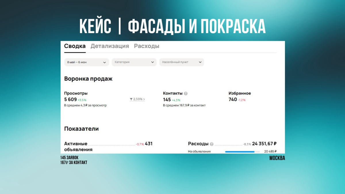 Кейс по настройке рекламы на Авито в нише фасады и покраска. Над проектом работала Кристина Саргсян Потратили 24.351р Привлекли заявок 145 Цена заявки 167р Клиент обратился по рекомендации. Он обнулил свой бизнес и начал все сначала, у клиента свой цех по изготовлению фасадов из массива, так же занимается покраской любых деревянные изделий, есть возможность фрезеровки материала. Какие цели и ожидания от площадки Авито, вы узнаете в конце! Рекламный бюджет: до 50.000 рублей Привлечь заявки на услуги Попробовать данную площадку, без особых ожидании 1) Провели анализ конкурентов 2) После анализа определили стратегию по которой будем работать чтобы максимально правильно расходовать бюджет и получить лучший результат 3) Создали дизайн авито магазина и наполнили его всей нужной и актуальной информацией, выделили уникальное торговое предложение, а так же преимущества компании. 4) Подготовили 5 объявлений 5) Сделали SEO оптимизацию