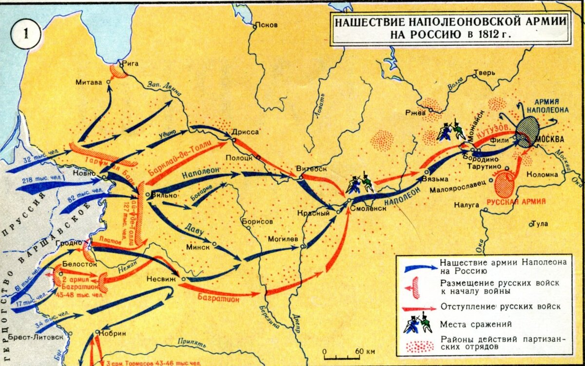 Русская армия, командуемая Михаилом Кутузовым, избрала тактику отступления вглубь страны, избегая крупного сражения с Наполеоном. Кутузов понимал, что в прямом столкновении с французской армией русские могут потерпеть поражение, и поэтому он решил изматывать противника длительными маршами и партизанскими действиями.