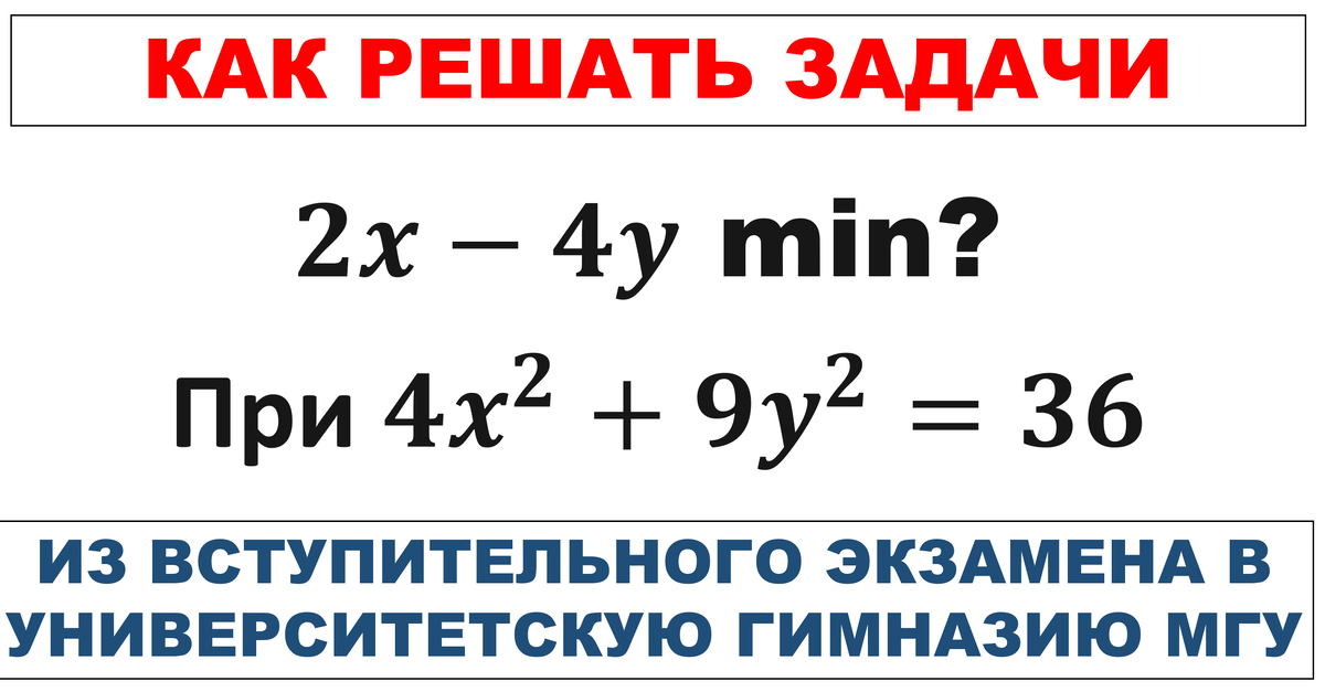 Меня часто спрашивают, как научиться решать задачи из вступительного экзамена по математике в Университетскую гимназию МГУ? Этим мастерством действительно необходимо овладеть, если вы хотите поступить в эту школу. Без подготовки сделать это очень сложно. Разберём на примере вот такого задания из демонстрационного варианта 2024 года: Найдите наименьшее значение выражения 2x-4y на множестве переменных x и y, удовлетворяющих условию 4x^2+9y^2=36? Итак, нам нужно найти наименьшее из возможных значений выражения 2x-4y = t, при условии, что на переменные x и y наложено условие: 4x^2+9y^2=36. То есть имеет место следующая система уравнений: Определим, при каких значениях t система имеет решения относительно (x; y), а затем из всех этих значений выберем наименьшее. Для этого выразим y их второго уравнения и подставим в первое. В результате получим уравнение: или после упрощения: Данное уравнение имеет решение относительно x в том случае, когда его дискриминант неотрицателен. То есть имеет мест