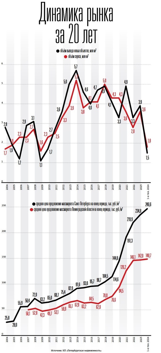 На фоне завышенных ожиданий от вступления закона в силу застройщики по привычке затарились проектами, что вызвало перегруз петербургского рынка. И за 2004 год в Петербурге было построено в 1,5 раза больше, чем за предыдущий, а количество квартир увеличилось почти в 2 раза: с 1,7 млн до 3,2 млн м2. При этом покупательский спрос снизился до уровня 2002 года. С октября 2004–го цены на первичном рынке начали падать: до конца года они снизились на 4–5%. В 2005 году динамика цен оставалась практически нулевой, а продажи падали.