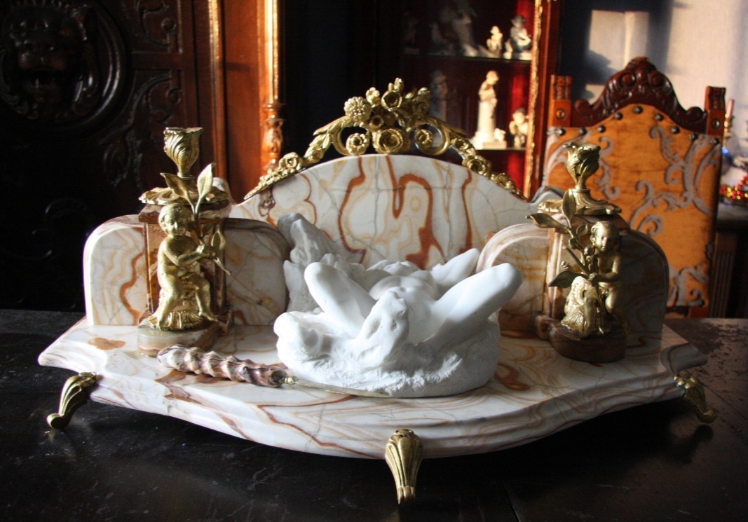 Пробуждение нимфы Зашел ,как- то , к хорошему знакомому , спросил у него камня ненужного, и простой вопрос оказался в попад, так как среди глыб оказался прекрасный кусок оникса, из которого я сделал этот кабинетный набор. Иногда сам рисунок камня, его текстура подсказывают художнику мотив будущего произведения. А тут насмотрелся скульптур Родена и понеслись идеи "по кочкам", как создать композицию. На блашином рынке купил старинную бронзу с путти( малыши взяли в свои ручки веточки , создавая легкие дуновенья, наполняя пространство утреней свежестью) и герляндой, парфирки под подсвечники. Золоченную бронзу покрыл новым золотом, потом вырезал оникс причудливой формы, оставалось начать моделирвать нимфу.Конечно, делать скульптуру из головы мучительное занятие, но результат все же состоялся.Из куска белоснежного итальянского мрамора с пластелиновой модели я вырезал нимфу, тонко проработал мелкие детали на ней. С белым мрамором молочного цвета нимфа ожила, налилась в формах, рад