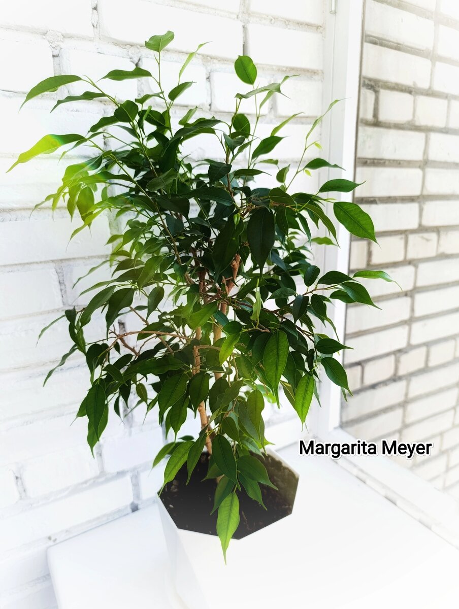 Фикус - вид растений из рода семейства Тутовые. Вечнозелёное дерево или кустарник, в дикой природе вырастает до 25 м в высоту. Распространён в Индии, Китае, Юго-Восточной Азии, на Филиппинах, на севере Австралии. Уход за фикусом Бенджамина: 🌿 Освещение: Яркий, рассеянный свет. 🌿 Полив: Поливать, когда верхний слой почвы просохнет. 🌿 Влажность: Фикусу нужна высокая влажность. Регулярно опрыскивайте листья. 🌿 Температура: Оптимальная температура - 18-25°C. 🌿 Пересадка: Молодые фикусы пересаживают ежегодно, взрослые - раз в 2-3 года. 🌿 Подкормка: В период роста подкармливайте удобрением для комнатных растений. Я свой фикус подкармливала коньяком пару раз (1-2 ст.л. коньяка на литр воды). Так же в такой раствор можно ставить срезанные цветы, они будут стоять дольше. Размножение: 🌿 Черенками: Срежьте верхушечный или стеблевой черенок и укорените в воде или субстрате. Правда, не все побеги дают корешки. Обычно лучше укореняются одревесневшие или полуодревесневшие черенки. Совсем