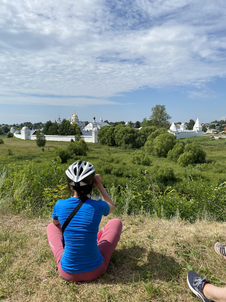 Третий день. Возвращаемся во Владимир, но сначала немного проезжаем по Суздалю. Я очень люблю этот тихий уютный город, но тут лучше, когда нет туристов. Возможно вернусь сюда в сентябре, но уже без велосипеда. На главной площади продают варенье из огурца, вчера тут масштабно праздновали день этого овоща. Варенье я брать не стала, а взяла себе 0,5 безалкогольной медовухи, думала, что в Нижний ее довезу. Выезжаем из Суздаля по асфальтированной дороге, машин мало, ехать хорошо, небольшие подъемы не вызывают у меня особого дискомфорта. Кажется, что ехать не так тяжело. Да и утро было не таким уж жарким. Однако, когда мы съехали на полевую дорогу горки стали круче и их было бесконечно много. Жара снова усилилась и казалось, что чем круче горка, тем сильнее жарит. Я периодически спешивалась и в просто заводила велосипед в горку. К слову, силы заканчивались не только у меня, ребята тоже спешивались и спрашивали, а что так горок много? Ехать дальше помогали как всегда прекрасные виды и на