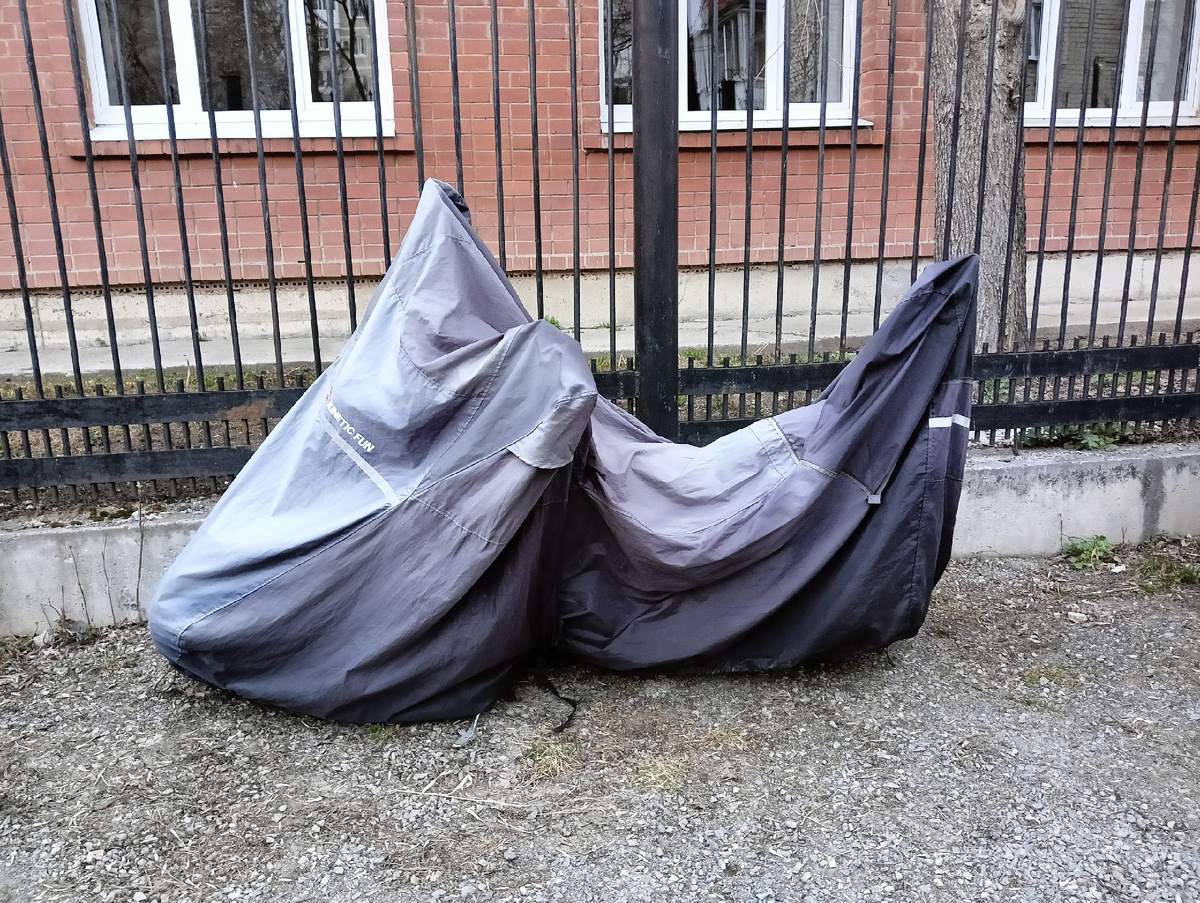 Сразу с покупкой Вулкана приобрёл к нему чехол. Выбрал по рекомендации из видосов Чужого - Kinetic Fun. Понравилось, что на сайте есть удобная примерялка чехла под свой тип мотоцикла. На мотоцикле в тот момент не было сиссибара, но была идея его поставить. Продавцы подсказали, что можно взять чехол-трансформер. Задний выступ был спрятан под молнию, пока спинки на мотоцикле не было. А когда сиссибар поставил, то чехол развернул по полной. Понравилась продуманность изделия. Есть утяжки по кромке и ремешок под днищем, чтобы чехол не сдуло ветром. Пришиты светоотражающие полосы спереди и сзади - поможет автомобилям заметить стоящий в темноте мотоцикл. Продумана сеточка в верхней части, чтобы испарялся конденсат. Есть удобная сумочка, пришитая к чехлу, а значит не потеряется. Когда отправляюсь в дальнюю поездку, то скручиваю чехол сам в себя и закрепляю на мотоцикле. Вроде это всё мелочи, но в совокупности они создают удобство применения. Зачем мне чехол на мотоцикл? А ещё под чехлом можн