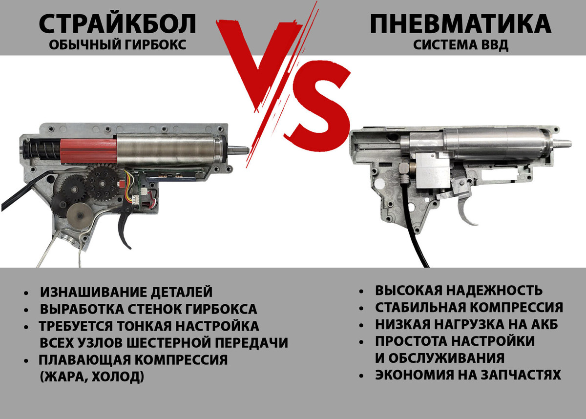 Основные преимущества системы ВВД перед классическим гирбоксом в страйкбольном оружии: