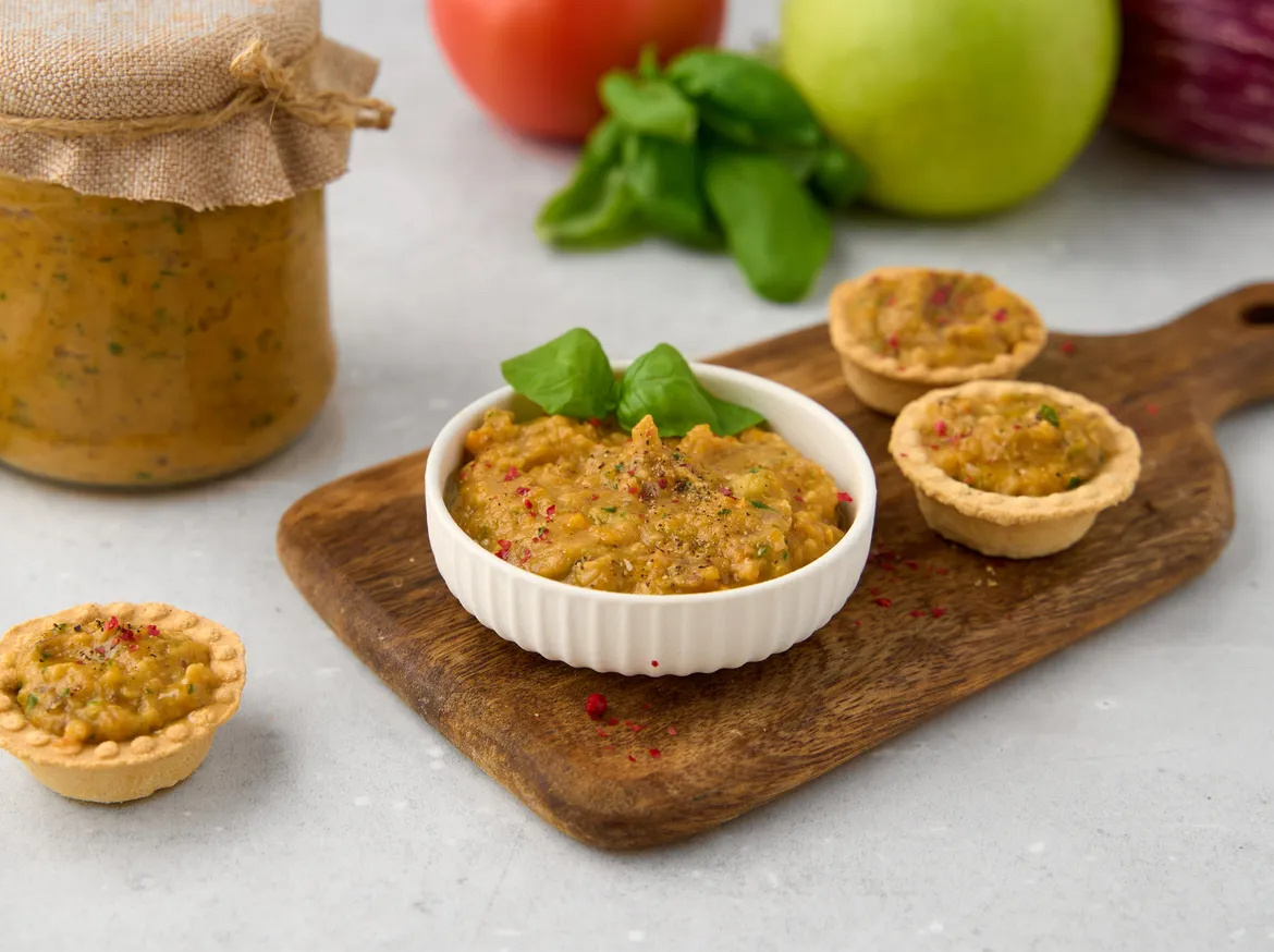 Паста из баклажанов очень пригодится, когда захочется положить на бутерброд или в сэндвич что-то легкое и малокалорийное или понадобится густой овощной соус к жареному мясу и колбаскам. Это питательная, неострая, с мягкой томатной кислинкой закуска, которую легко приготовить в сезон нового урожая овощей. Морковь можно не запекать с баклажаном, а просто отварить, но так у нее появится приятный карамельный привкус. 1) Помойте баклажан, яблоко, помидор, петрушку и базилик. Обрежьте у баклажана и моркови кончики. Вымойте и почистите морковь. Достаньте разделочную доску, блендер с чашей, банку объемом 0,3 л с винтовой крышкой. Простерилизуйте банку и крышку удобным для вас способом. 2) Включите духовку разогреваться до 150˚С. Нарежьте морковь вдоль длинными ломтиками толщиной около 6-7 мм. Разрежьте баклажан вдоль пополам. 3) Застелите противень пергаментной бумагой. Разложите на нем ломтики баклажана и моркови. Поставьте в духовку и запекайте в течение 30-40 минут до мягкости. Достаньте
