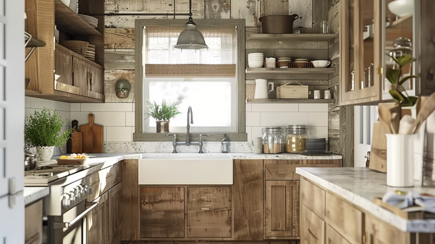 В интерьере кухни используются старинные или намеренно состаренные элементы, которые придают ему особый шарм.