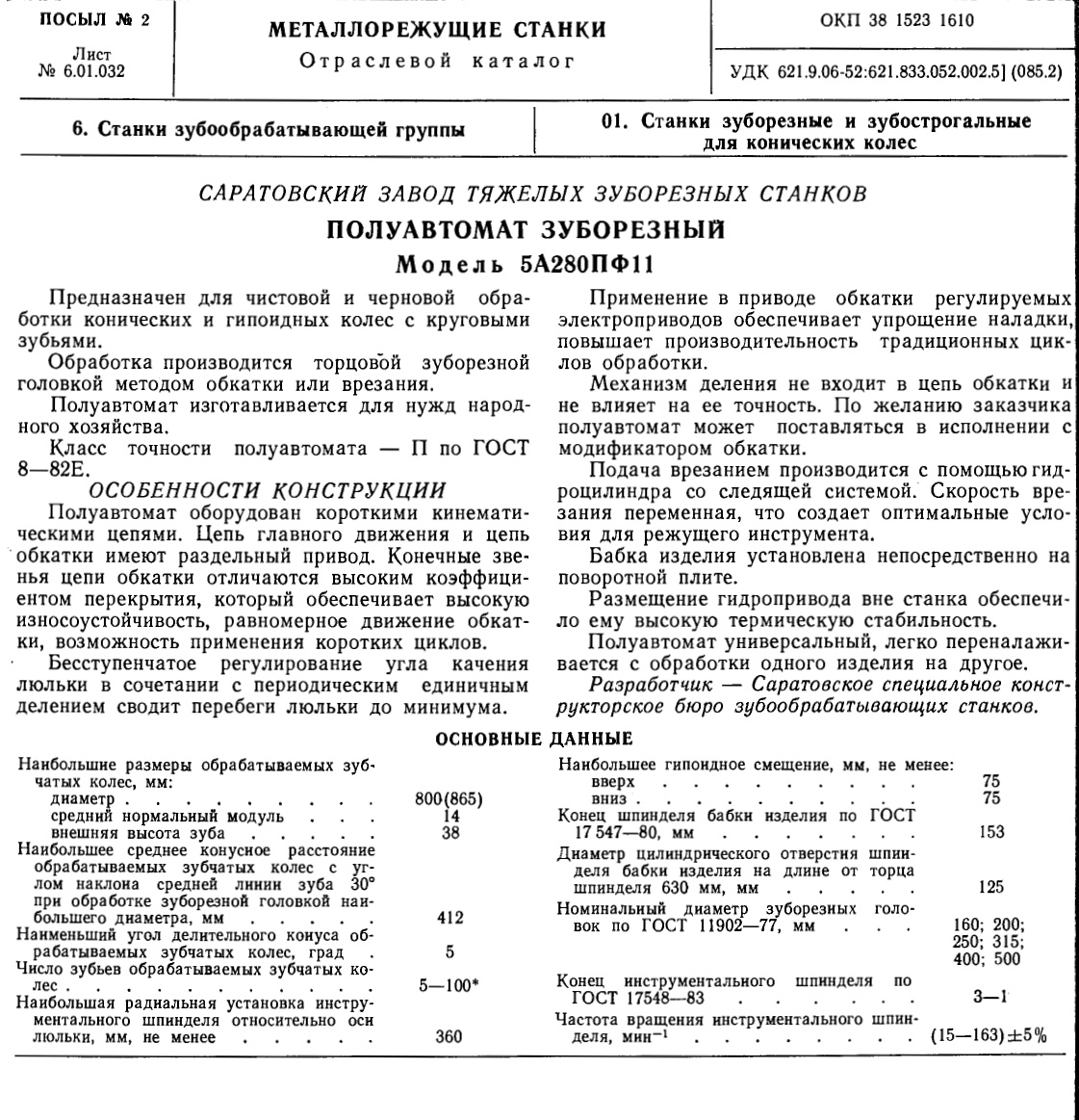 Технические характеристики на полуавтомат зуборезный 5А280ПФ11