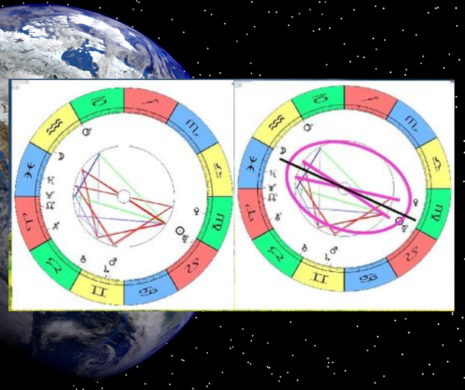 Если посмотреть на график слева, то можно увидеть, что образуются 2 Т-квадрата (2 красных треугольника) и Yod (зеленые линии). Все три фигуры считаются особенно сложными. Все это также связано с суперполнолунием 19 августа. Один Т-квадрат находится между оппозицией Сатурна и Венеры, оба квадрата - между соединением Марса и Юпитера. Квадрат между Венерой и Марсом символизирует несовместимость мужских и женских энергий. Соединение Юпитера с Марсом многократно усиливает мужские, агрессивные энергии. Третий ко