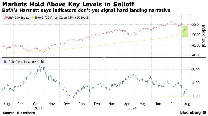 Прогнозируется спад, если акции компаний-победителей упадут ниже 200-дневной скользящей средней. Лидеры в области искусственного интеллекта будут колебаться во втором полугодии в районе текущих уровней, если прибыль не будет блестящей: BofA По мнению Майкла Хартнетта из Bank of America Corp., турбулентность на мировых финансовых рынках еще не достигла масштабов, которые свидетельствовали бы об опасениях по поводу жесткого экономического спада. Несмотря на то, что индекс S&P 500 упал примерно на 6% с рекордного уровня середины июля, бенчмарк удерживается выше 200-дневной скользящей средней на отметке 5050 пунктов, в то время как доходность 30-летних казначейских облигаций США не опускается ниже 4%. «Технические уровни, которые могли бы перевернуть представление Уолл-стрит о "мягкой" посадке к "жесткой", не были пробиты", - пишет Хартнетт в своей записке. "Инвесторы "взволнованы", но ожидания снижения ставок Федеральной резервной системы означают, что инвесторы по-прежнему отдают предпоч