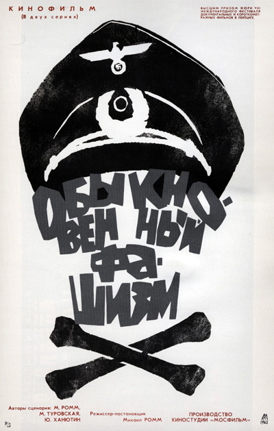 Фильм «Обыкновенный фашизм» (1965 г.) Режиссёр: Михаил Ромм «Показывая вам нашу картину, мы, разумеется, не рассчитывали осветить все формы такого явления как фашизм. Это невозможно в пределах одной картины. Да это невозможно хотя бы потому, что многое, очень важное, не оставило никаких следов на пленке. Не было снято. Из огромного количества материала мы отобрали то, что показалось нам самым поразительным, что дает нам возможность вместе с вами поразмышлять...» 1965 год... Прошло двадцать лет со дня Победы, подросли те, кто не видел страшную войну, кто родился уже в мирное время. На экране разворачиваются кадры кинохроники, архивные материалы, фотографии. Перед зрителями проходят сотни, тысячи лиц живых, мёртвых, улыбающихся, хмурящихся. Восторженно зигующих сменяют испуганные люди. Вот радостный фюрер, его верные соратники, благодарные немцы. А вот замученные дети, уничтоженные узники концлагерей. Кадры современности сменяются хроникой: улыбающаяся детвора, которая играет, рисует и