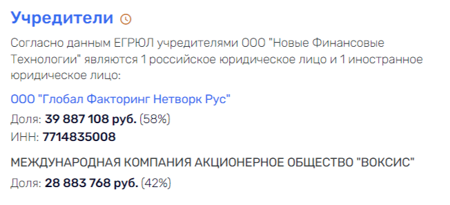В этом свете крайне интересно, кто же стоит за такой чудесной площадкой. 58% ООО «Новые финансовые технологии» принадлежит ООО «Глобал Факторинг Нетворк Рус», оставшиеся 42% за международной компанией АО «Воксис». Т.е. уже по одному этому понятно, что деньги инвесторов могут «уплыть» за рубеж.