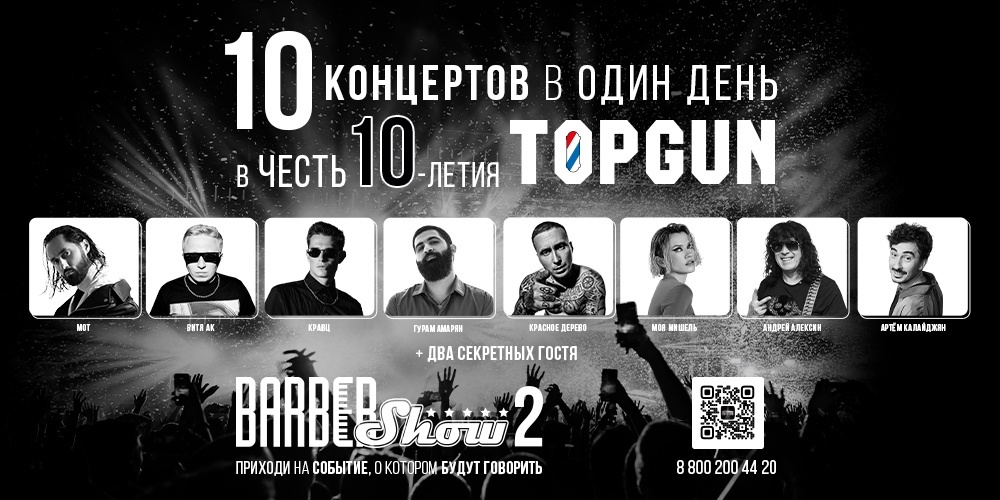 16 июля 2024 года TOPGUN отпраздновал своё 10-летие на великолепной вечеринке, которая прошла на крупнейшей площадке Москвы — МТС LIVE HALL. Гости мероприятия получили невероятный заряд драйва и позитива, ведь в один день состоялось сразу 10 концертов! Ведущим вечера стал популярный российский актер и телеведущий Денис Косяков. Поздравить нас с юбилеем пришли такие артисты, как Мот, The Hatters, Моя Мишель, Radio Tapok, Кравц, Витя АК, Красное дерево и Андрей Алексин. Также зрителей развлекали известные стендап-комики Гурам Амарян и Артем Калайджян! 40 барберов, отобранных звездными судьями, сразились за первое место в уникальном barber battle с общим призовым фондом 2 000 000 рублей! В течение всего мероприятия среди гостей разыгрывались ценные призы, а кульминацией стал розыгрыш автомобиля Dodge Challenger! На развлекательной зоне автосимуляторов TOPRACING весь день проходили захватывающие гонки за призовые места с общим фондом 300 000 рублей! И, конечно, без обучения не обошлось! В