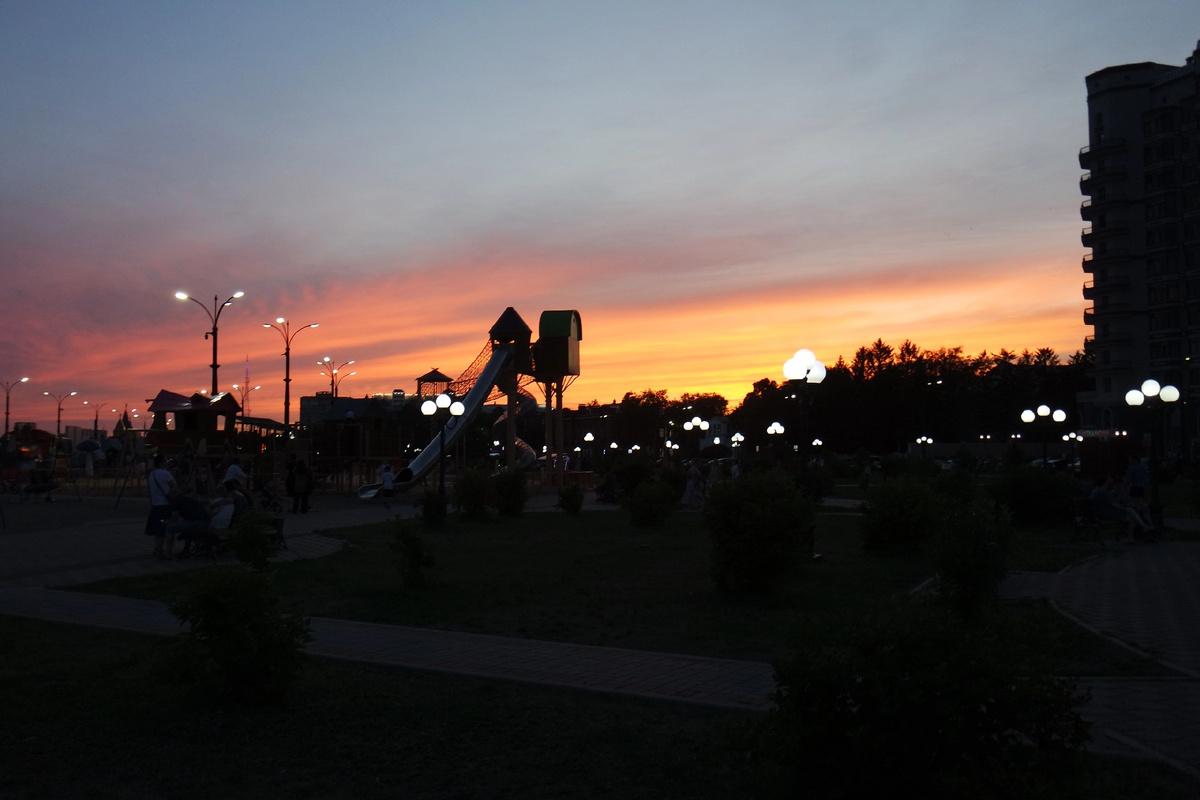 Если меня спросят порекомендовать город для отпуска, то я секунду подумаю и отвечу: - Благовещенск: Где-то на улице Шевченко: Да, почему я рискнула покататься на колесе обозрения (я боюсь высоты и каких-то... кружений, если честно-то...) в Благовещенске? - во-первых, в отлич. от Кисловодска тут не на горе - то есть низко. Во-вторых - оно вообще не скрипело. В-третьих... я прочитала, что с ними меньше всяких неловких ситуаций, как с новыми, когда ты застрял и сидишь, пока электричество не дадут. Например. Советское колесо хорошо, чем? - тем, что ты не в замкнутой кабинке сидишь и едва дышишь. Плюс его всего можно вручную "отмотать" вниз, поэтому с ним фактически не бывает несчастных случаев (за исключением тех печальных, когда люди... намеренно прыгают, ну это всё же их... выбор, поэтому...). Меня очень насмешила возможность поглядеть в окна соседнего дома:) там у котов есть супербалкон;) Смотрю на "Ветерки-Вихри" после опыта пршлого года с опаской: -Я вас боюсь! Каталась в два года (у