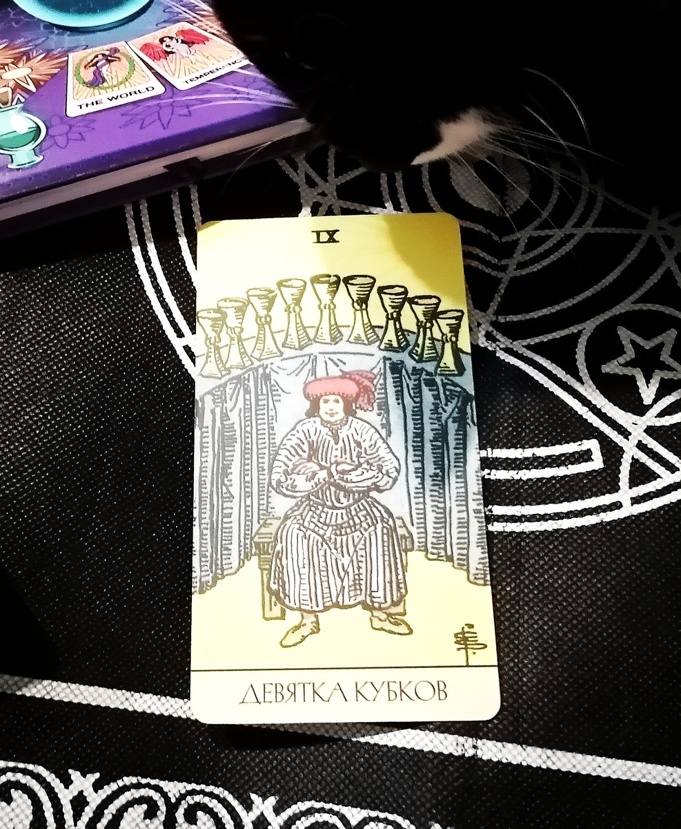 Карта сегодняшнего дня - девятка кубков. Что она несёт? Позитив - раз. Исполнение маленького желания - два. Скоро завершится какое-то важное для вас дело и будет результат - три. Хорошее настроение без причины - четыре. Кстати, где-то читала, что мужик, изображённый на карте навеселе... И сразу стало понятно, почему день будет таким хорошим.😁😁😁 Всем арера, как говорится😁