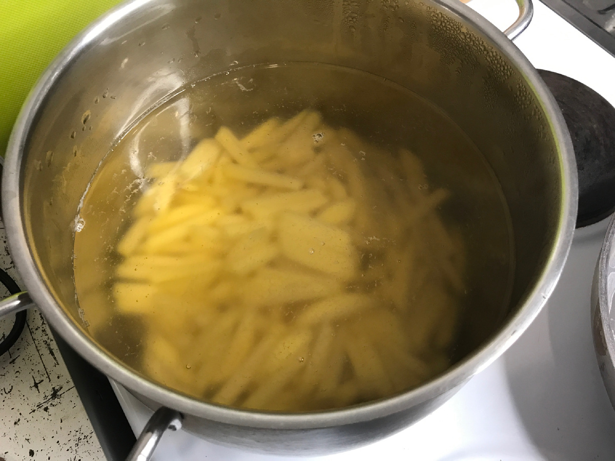 Как вода закипит, кидаем картофель. Так как у меня все ингредиенты готовы, кроме картошки и лука, их нужно просто нарезать.