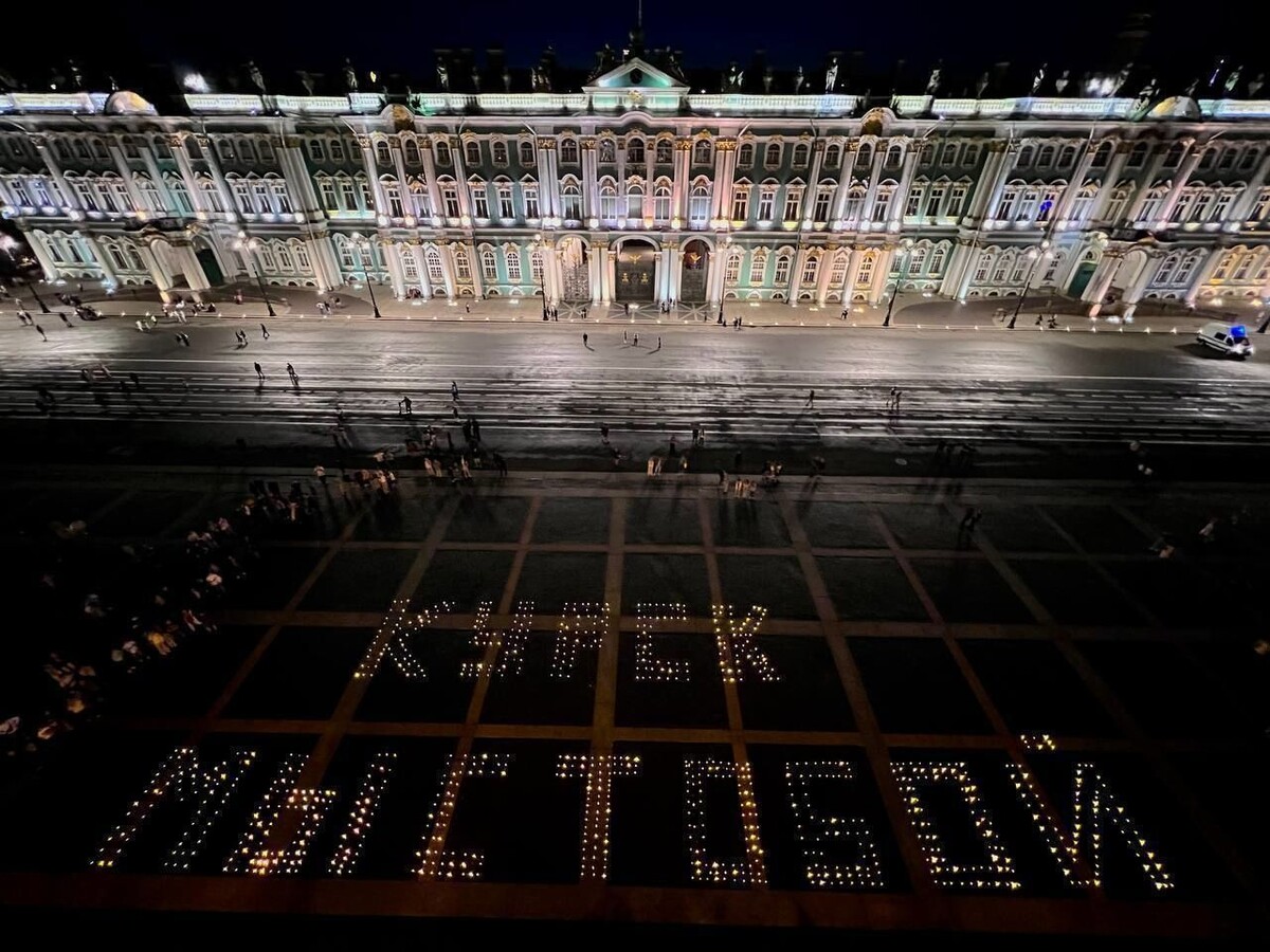 Вечером в пятницу, 9 августа, на Дворцовой площади Петербурга прошла акция в поддержку жителей Курской области. У Эрмитажа зажгли сотни свечей. Из них выставили надпись: «Курск, мы с тобой».