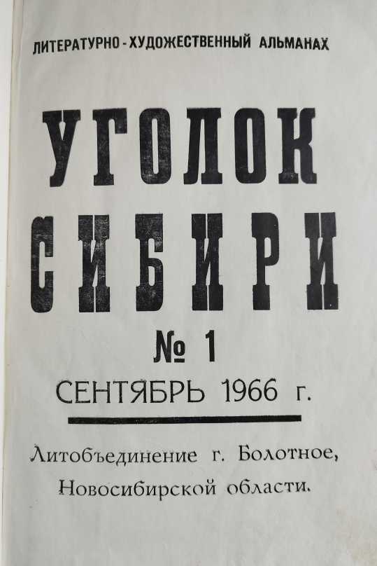 В сентябре 1966 года литературное объединение города Болотное выпустило первый номер (№1) рукописного литературно-художественного альманаха «Уголок Сибири». Редколлегия этого альманаха состояла из редактора – Карнеевой (преподавателя Болотнинской школы рабочей молодежи № 8), Скарговского П.П.(директора школы рабочей молодежи № 8), Яковлева В.Т.(преподавателя Болотнинского педучилища), Мельниковой А.А., Тельпухова Н.И.(сотрудника редакции районной газеты «Путь Ильича»), Большакова Г.Ф.(заместителя редактора «Путь Ильича»).