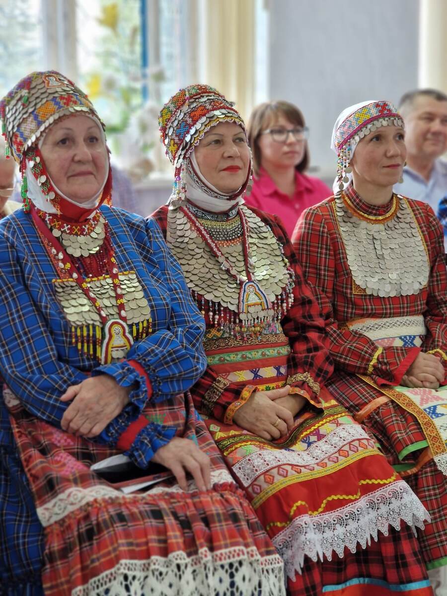 Мы собрались в актовом зале Белебеевского информационного центра. Торжественную часть открыла Луиза Степановна Фёдорова, председатель Белебеевского отделения союза чувашских женщин Башкортостана "Салампи" и руководитель Народного чувашского фольклорного ансамбля "Илем". Как и положено по обычаю, гостей встретили песней. Меня восхитила стать и блеск в глазах уже неюных исполнительниц. Я постаралась запечатлеть портреты этих одухотворённых женщин, чтобы потом в тишине разглядывать узоры на тухье, необычайно красивые платья и фартуки. В таком выходном платье из красной шотландки, сотканной собственновенноручно, ходила м