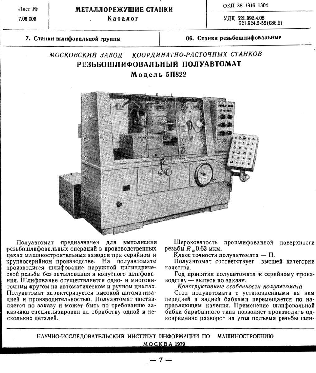Технические характеристики на резьбошлифовальный полуавтомат 5П822