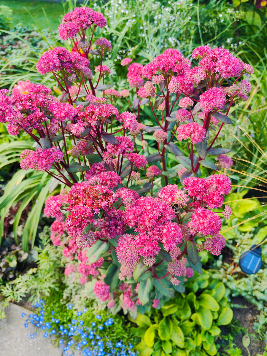 Продолжают свой парад очитки. Очиток большой уже в полном роспуске. Красные стебли придают ему ещё больше яркости. Он очень охотно посещается шмелями и пчелами. Очиток обыкновенный Пурпурный Император радует меня уже давно. Его соцветия распускаются одновременно и остаются цветущими очень продолжительное время. В этом году впервые увидела на нем гусеницу, обычно на него никто не покушается. Зарозовел очиток обыкновенный. Он будет цвести до конца сентября. Продолжает своё исключительно продолжительное выступление рудбекия волосистая. Лилейник Отум Ред присоединился к ней, процвёл и уже заканчивает своё цветение, а она всё по-прежнему хороша. Рядом поддерживает солнечную гамму гелениум гибридный. В череде бесконечных дождей это оказывается очень кстати: хоть какое-то подобие солнца - если не на небе, то в отдельно взятом уголке сада. Если уж речь зашла о жёлтом цвете, то нельзя не упомянуть бузульник зубчатый Бритт-Мари Кроуфорд. Её жёлто-оранжевые ромашки жизнерадостно тянутся к н