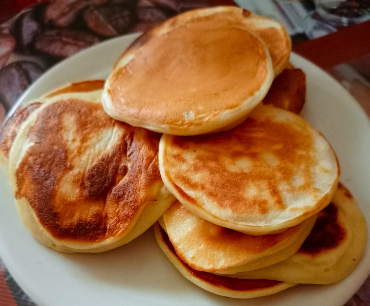 Для приготовления понадобится 2 яйца, 3 столовые ложки сахара, 500 мл кефира, 10 столовых ложек муки с горкой (смотрите по густоте теста), сода на кончике ножа. Все перемешать венчиком, тесто должно быть гуще, чем сметана. Выпекать на смазанной маслом сковороде (смазываю только в самом начале, потом пеку на сухой сковороде) с двух сторон. Хоть со сметаной, хоть с джемом очень вкусно! Приятного аппетита! Спасибо за просмотр!