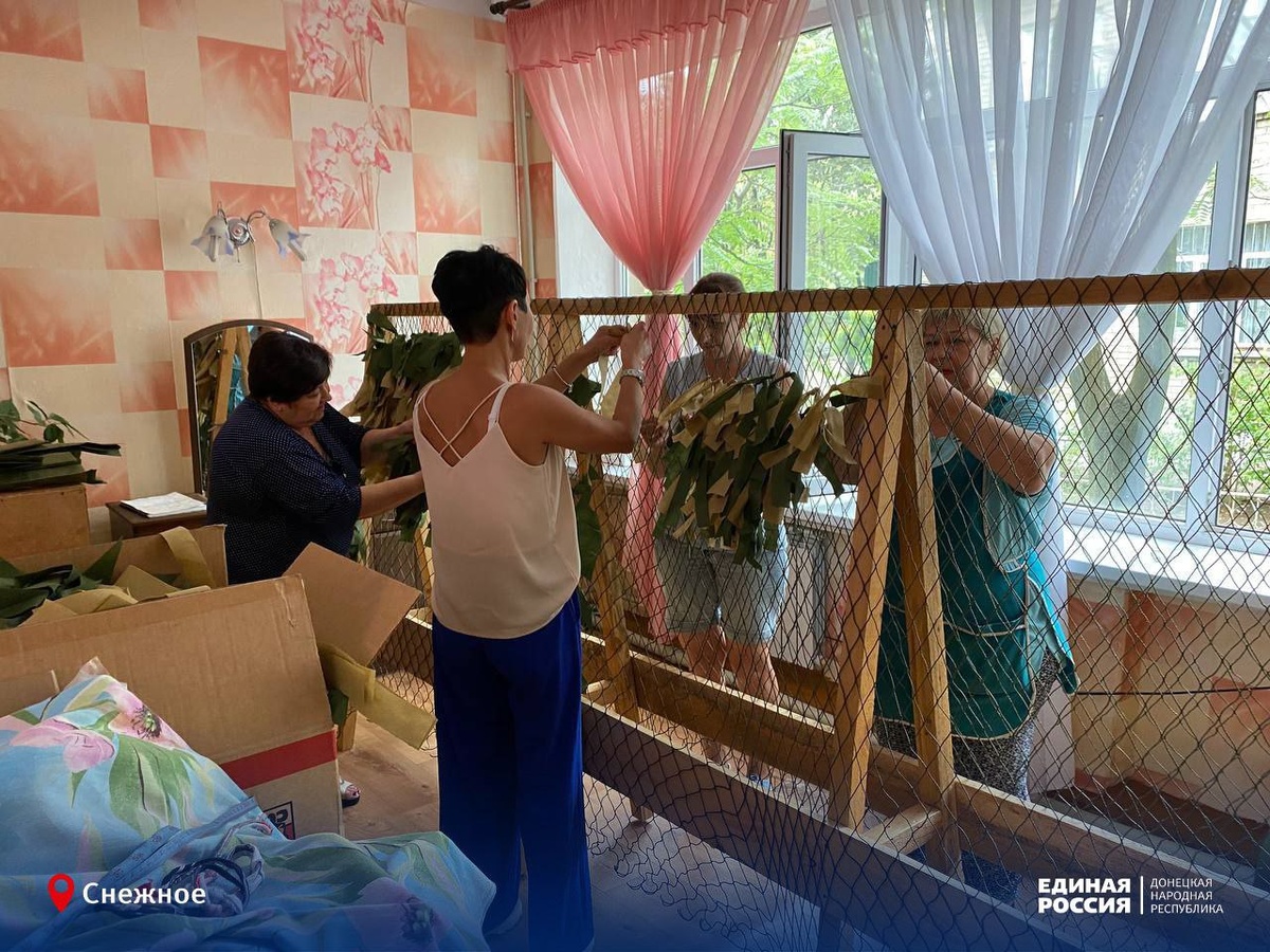 Участники партпроекта Единой России «Старшее поколение» совместно с региональной общественной организации Союз казаков Кубанив и Еленой Петрухиной, депутатом Снежнянского городского совета, сплели маскировочные сети для автотранспорта.