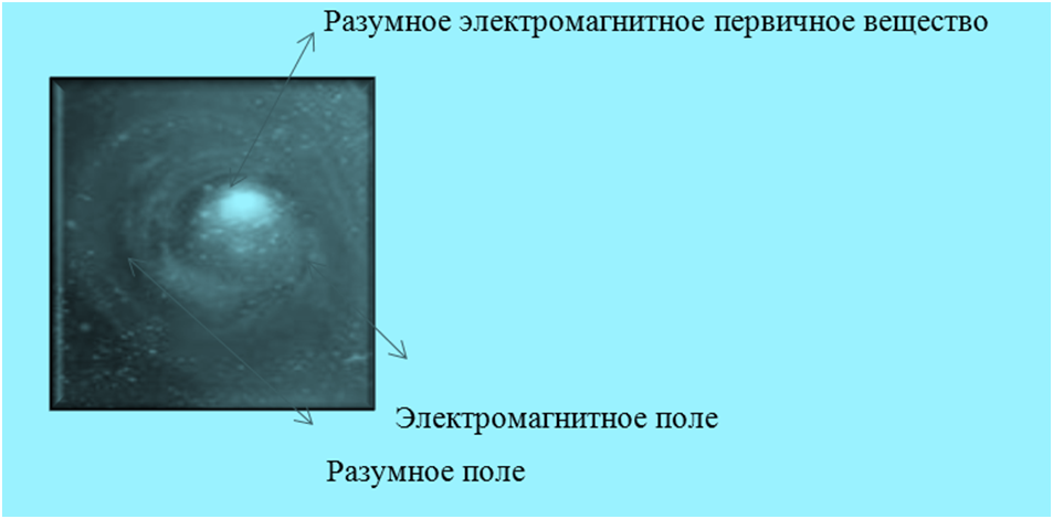 Исходя из того, что все естественные объекты разумны и имеют вещественное тело, целесообразно считать, что каждый первичный (основной) естественный энергетический элемент представляет собой «разумное электромагнитное первичное вещество» - «элементарный энергетический заряд», имеющий «распределённую массу».(Смотри Рисунок)