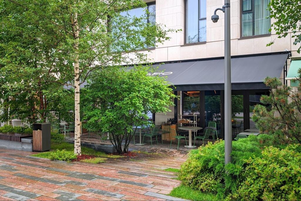Если не считать фестивальный сет, часть блюд из которого нашел в меню ресторана и через пару лет, смотрел со стороны на творчество Марии целых три года. Смотреть со стороны на фасад сложно: пространство ЖК One Trinity Place превратили в джунгли. И вроде стоит похвалить за «озеленение», но все это кажется каким-то перебором, когда совсем нет собственно площади, пространства, архитектур всяких. Когда вся эта «высадка» кажется спонтанной, перебор с зеленой краской. Вдоль ресторанов и по центру. Как на соревновании (американских) лужаек, где как будто каждый старался нафигачить больше, но не лучше. Я даже не про сами четыре известных заведения в ряд, я про всех актеров большой пьесы!