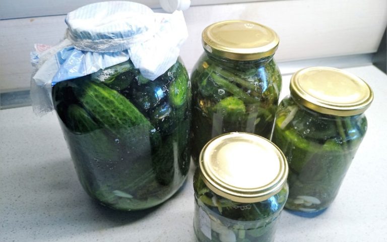 При термической обработке ярко-зелёная кожица свежих огурцов меняет окраску на более тусклую, болотную. Чтобы огурцы сохранили естественную изумрудность, есть несложный способ засолки. Для рассола на 2 кг огурцов понадобится 1,5 л воды, 75 г соли и 50 г водки. Кроме того, обязательно возьмём пряности – горсть листьев вишни и чёрной смородины, зонтики укропа и пару свежих листьев или 20 г корня хрена, несколько долек чеснока. Такое количество продуктов из расчёта на одну трехлитровую банку. Листья и укроп моем, даем стечь излишкам воды. Свежие (не переросшие!) зелёные огурцы тоже хорошенько моем, обдаем кипятком и сразу же окунаем в очень холодную воду. Затем плотно, но, не надавливая, укладываем их в заранее простерилизованную и остывшую банку, в которую также добавляем чеснок, листья вишни и смородины, хрен, укроп. В кипящей воде растворяем соль. Заливаем огурцы и выдерживаем 5 минут, прикрыв банки стерильными крышками. Сливаем рассол в кастрюлю, доводим до кипения и повторно заливам