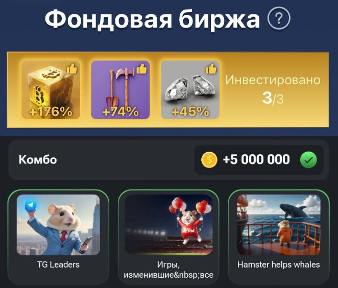 На 10 августа 2024 года в игре Hamster Kombat актуальные комбо-карты включают следующие: Для получения 5 миллионов монет в игре Hamster Kombat на 10 августа 2024 года, необходимо найти и улучшить следующие три комбо-карточки: Кроме того, чтобы заработать дополнительный 1 миллион монет, вы должны ввести сегодняшнее слово-шифр в разделе "Daily cipher". На 10.08 шифр следующий: На сегодня, 10 августа, код Азбуки Морзе (Daily Cipher) такой: Комбинация: N — •