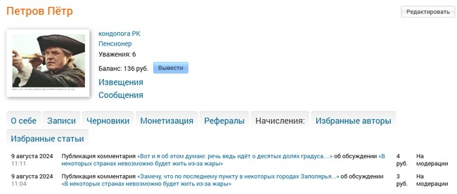 Вчера утром ( время и дата указаны) я отправил туда два коммента к статьям других авторов. Как вы уже знаете, там 100 знаков оцениваются как один рубль. По этому признаку вы можете оценить длинноту этих комментов.