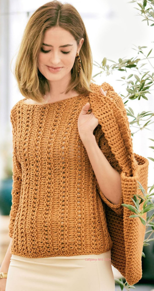 Пуловер с горловиной-лодочкой и связанная крючком сумка