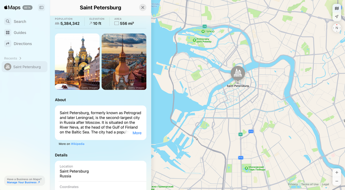 Apple реализовала поддержку Apple Maps в Интернете в июле, и сейчас они доступна в виде публичной бета-версии. Веб-интерфейс можно использовать для просмотра маршрутов пешком и на автомобиле, поиска мест для посещения, просмотра рейтингов и часов работы, а также просмотра коллекции путеводителей.