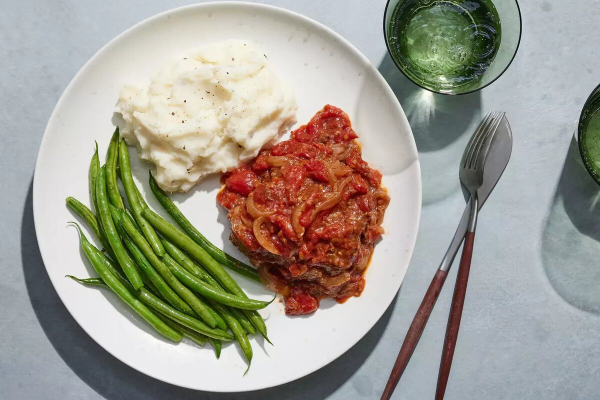 Этот классический стейк по-швейцарски с шелковистым томатным соусом. Секрет в том, чтобы купить менее дорогие куски стейка, смягчить их перед приготовлением, а затем дать им медленно потушиться в сочном соусе из помидоров и лука. Хотя вы можете подумать, что швейцарский стейк родом из Швейцарии, на самом деле его название происходит от техники «свиссинга», позволяющей смягчить мясо. Жесткие куски говядины отбивают вручную, или пропускают через машину для приготовления швейцарского стейка, и выходят с другой стороны с углублениями в форме кубов (отсюда и другое название — кубический стейк). Классический стейк по-швейцарски подают с зеленой фасолью и картофельным пюре. Он также отлично сочетается с запеченными овощами и кукурузой в початках или с рисом. Стейк Солсбери готовится из говяжьего фарша, сформированного в лепешку, а швейцарский стейк — это, собственно, бифштекс. Кроме того, к стейку Солсбери обычно подают соус, состоящий из говяжьего бульона, а швейцарский стейк известен тем, ч