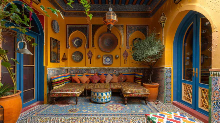 Стиль марокко в интерьере предполагает использование в дизайне ярких, насыщенных цветов и замысловатых традиционных орнаментов. Если есть возможность, часть стен можно украсить штукатуркой или краской, оставляя неровности и небрежные мазки. Нередко дом декорируют мозаикой или плиткой. Полы могут быть выложены плиткой или камнем, но есть и менее радикальный вариант — ковры и циновки ручной работы.