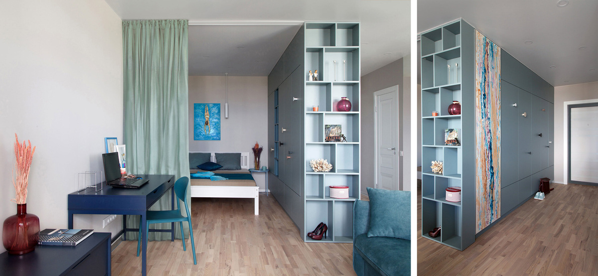 Чем больше в квартире мест хранения, тем удобнее в ней жить. А чем удобнее в ней жить, тем легче её сдать за хорошие деньги! Вот ещё больше приёмов, которые помогут вам совместить практичность и изящество. Фишка этого решения — в сложной колористике: цвет, который вы выберете основным акцентом, нужно реализовать не в одном тоне, а в богатой гамме близких оттенков — и разнести их по всему интерьеру. Так, словно пространство квартиры — это полотно художника, и выбранный цвет «пролился» на холст в сложных переходах. Шкаф тогда вообще необязательно делать светлым — он может быть и очень активного цвета, который в любом случае затеряется в общей картине. Главное, чтобы оттенок был сложным, природным, глубоким и не самым ярким из гаммы: внимание всё равно должно соскальзывать на другой предмет — картину, диван, стол, текстиль. Пример реализации. Для этой квартиры с морским настроением дизайнеры Андрей и Алла Соловьевы подобрали сложную гамму синих и голубых оттенков с разными нюансами серог
