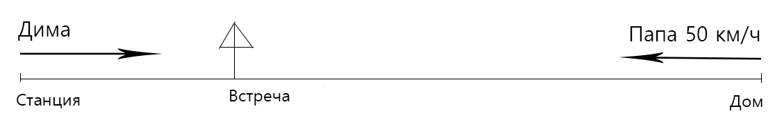 Дима должен был попасть на станцию в 18:00. К этому времени за ним из дома должен был приехать отец на автомобиле. Однако Дима успел на более раннюю электричку и оказался на станции в 17:05. Он не стал дожидаться отца и пошёл ему навстречу. По дороге они встретились, Дима сел в автомобиль, и они приехали домой на 10 минут раньше рассчитанного времени. С какой скоростью шёл Дима до встречи с отцом, если скорость автомобиля была 50 км/ч? Папа должен был проехать от дома до станции и обратно, но ему повезло и он ехал от дома до встречи с Димой и обратно, тем самым сэкономил 10 минут. Это значит, что от станции до места встречи и обратно папа бы ехал 10 минут. Значит от станции до встречи с Димой на машине ехать 5 минут. 5 минут это 5/60 часа. Значит расстояние от станции до места встречи, это скорость папиной машины умноженная на 5 минут (5/60 часа) необходимых для преодоления этого расстояния. 50*5/60= 25/6 км Папа должен был быть на станции в 18:00, но Димо сэкономил ему 5 минут, поэтом