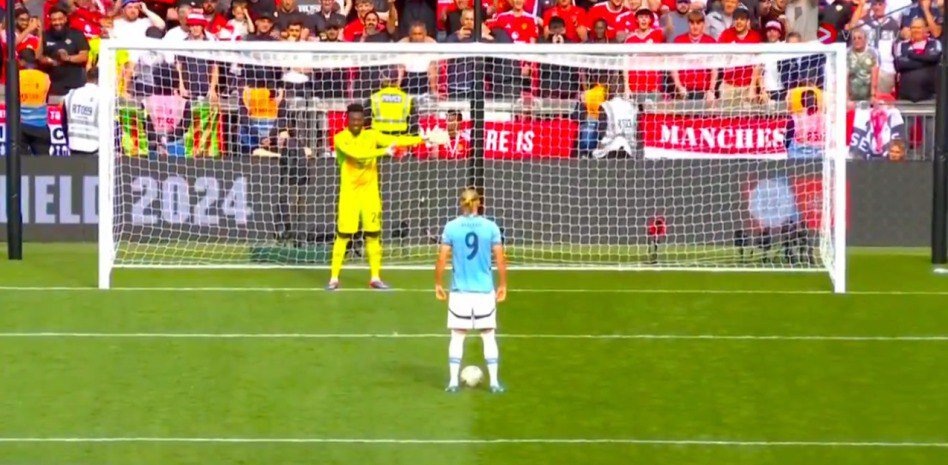 Онана освободил угол Холанду и рукой показывал туда во время серии пенальти в Суперкубке Англии. Эрлинг ударил в другой и забил