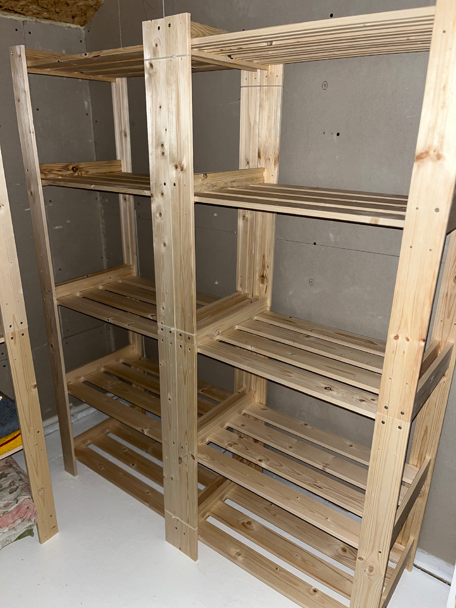 На 2 этаже начали организовывать гардеробную. Заказали деревянные полочки 5 штук, собирали сами. А сейчас буду заниматься организацией вещей. ☺️