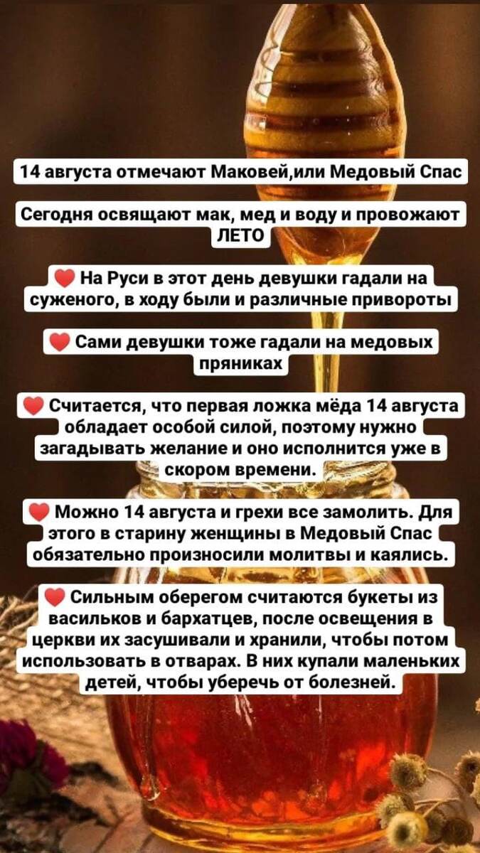 Первый из трёх Спасов отмечают 14 августа. В народе Медовый СПАС известен как время, когда пчёлы завершают свои труды. И если не собрать сегодня мёд, пчелы из соседних ульев могут унести его к себе. Прихожане сегодня освещают мёд и мак, пекут медовые коврижки. Сегодня надо готовить что-то из мёда и мака, ибо они наделены в этот праздник особыми целебными свойствами☝️. Сегодня блюда должны быть постными. Это первый день двухнедельного Успенского поста. Сегодня надо: