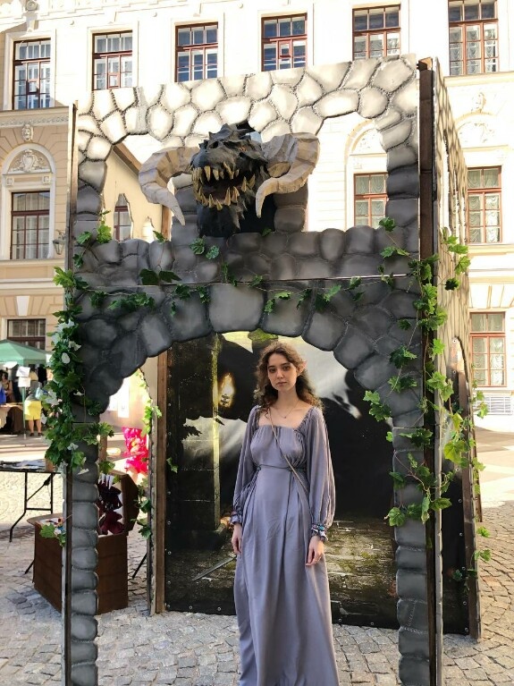 19 и 20 августа 2023 В Санкт-Петербурге проходил фестиваль фолка и фантазии "Волшебное древо". Я, как фанатка фентези, эльфов и ДнД, не могла пропустить это мероприятие. К тому же недавно я сшила себе платье, которое просто так не наденешь. Было очень неловко выходить из дома в таком виде. На улице я ловила на себе удивленные взгляды прохожих. Но в метро ко мне подошла девушка и сказала, что я очень красивая и мне стало спокойнее. Фестиваль проходил в центре города, не далеко от Дворцовой площади. Информацию о нём я нашла в группе вк, где была и программа мероприятия и его карта. Вот так выглядел вход на фестиваль. Тут расположились столики мастеров, деревянные игры и небольшой ларёк с едой. Отдельно есть вход в кинотеатр, где показывали аниме "Принцесса Кагуя" Исао Такахаты (об этом авторе я как-то рассказывала у себя на стриме на твиче😉). Если пройти дальше, то появляется сцена с музыкантами. Еще где-то должна была быть стрельба из лука, но видимо она была в первый день фестиваля. В