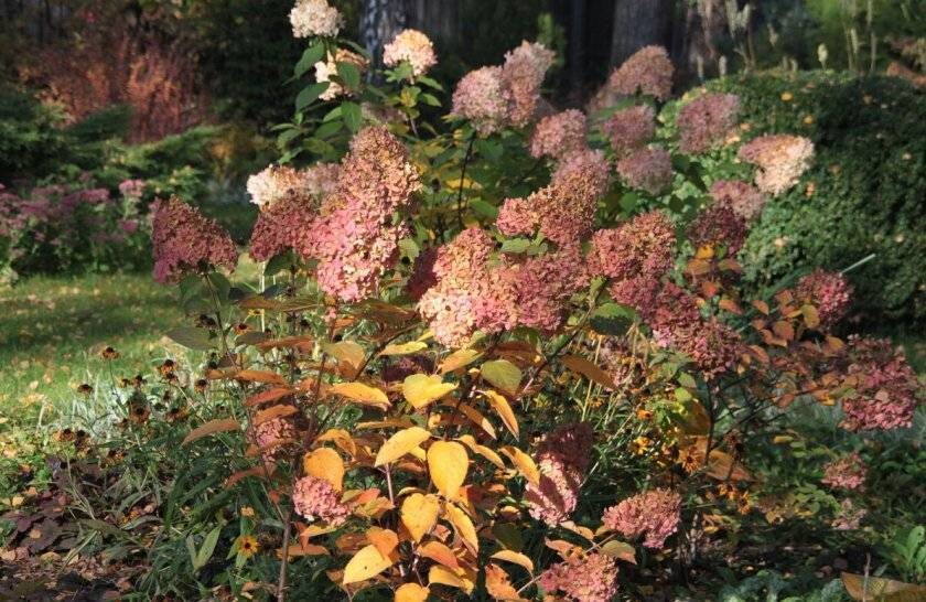 Соцветия гортензий также начинают потихоньку выгорать и отмирать, хотя у некоторых видов, например таких как Panicle Hydrangea (Hydrangea paniculata), соцветия могут оставаться на растении в течение зимнего периода, несколько оживляя пейзаж.