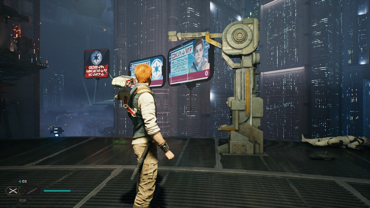 Зиплайны в игре Jedi: Survivor появляются ближе к завершению второй главы, когда действие происходит на планете Корусант (англ. Coruscant). На краю одной из площадок обнаруживается опора, которую можно активировать с помощью дроида напарника BD-1. После активации стальной трос соединяет эту опору со следующей точкой.